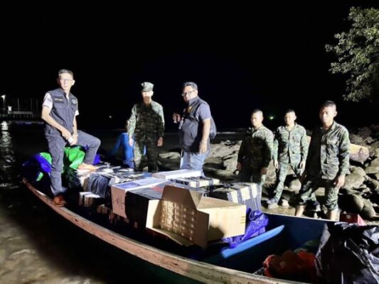 อ.คลองใหญ่ จ.ตราด วันนี้ 7 ธ.ค. 66 เวลา 10.00 น. ได้รับแจ้งจาก นาวาเอกนฤมิต ศุขสมิติ ผบ.นย.ตราด กองบัญชาการป้องกันชายแดนจันทบุรีและตราด ได้รับแจ้งจากแหล่งข่าวจะมีการลักลอบนำบุหรี่หนีภาษีเข้ามาทางทะเล ชายแดนบ้านหาดเล็ก อ.คลองใหญ่ จ.ตราด เมื่อกลางดึกของเมื่อคืนที่ผ่านมา หลังรับแจ้งข่าว จึงได้ประสานไปยัง (ฉก.นย.ตราด /มชด/1 ฉก.นย.ที่ 182 หาดเล็ก บูรณาการกำลังร่วมกันออกลาดตระเวนหน้าน้ำ จนพบเรือหางยาวต้องสงสัย เป็นเรือไม้มีผ้าใบปิดคลุมเรือไว้ มีชาย 1 ราย ทราบชื่อคือนายชุ รวน อายุ 41 ปี สัญชาติกัมพูชา เป็นคนขับเรือลำดังกล่าว บริเวณน่านน้ำไทย ( Lat ๑๑ องศา ๓๙. ๑๖๓ ลิปดา เหนือ Long ๑๐๒ องศา ๕๓.๔๔๘ ลิปดาตะวันออก) พื้นที่ บ.หาดเล็ก อ.คลองใหญ่ จว.ตราด จึงได้ขอทำการตรวจค้น พบการนำเข้าสินค้าที่มิได้เสียภาษีสรรพสามิตตาม พ.ร.บ. ภาษีสรรพสามิต พ.ศ.๒๕๖๐ เป็น บุหรี่ซิกาแรต ขนาดบรรจุ ๒๐ มวน จำนวน ๒๐,๙๕๐ ซอง (๔๑ หีบ ๔๕ แท่ง) จึงได้ควบคุมตัวพร้อมของกลางเรือหางยาว 1 ลำ และบุหรี่หนีภาษีทั้งหมดนำมาสอบสวนเพิ่มเติมยัง หน่วยเฉพาะกิจนาวิกโยธินที่ 182 บ้านหาดเล็ก เพื่อรอการตรวจสอบจากหน่วยงานที่เกี่ยวข้องต่อไป