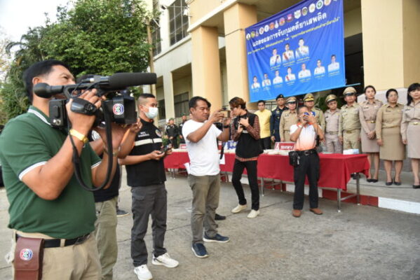 เมื่อวันที่ 14 ธันวาคม 2566 ที่หน้าศาลากลางจังหวัดศรีสะเกษ นายอนุพงศ์ สุขสมนิตย์ ผู้ว่าราชการจังหวัดศรีสะเกษ พล.ต.ต.พิษณุ วัตถุ ผบก.ภ.จว.ศรีสะเกษ พ.ต.อ.ศุภชัย ศักรินพานิซกุล รอง ผบก..จว.ศรีสะเกษ นายธาตรี สิริรุ่งวนิช ปลัดจังหวัดสรีสะเกษ พ.อ.กิตศิวรา อารีรักษ์ ผบ.ฉก.ทพ.๒๓ พ.อ.สิทธิศักดิ์ พรหมดิเดก ผบ.ฉก๓ ,พ.ต.อ.จิรประภาพ สุทธปรีดา ผกก.ตม.จว.ศรีสะเกษ และหัวหน้าส่วนราชการที่เกี่ยวข้อง ได้ร่วมกันแถลงผลการจับกุมเครือข่ายคดียาเสพติดตามยุทธการ ” พิฆาตทรชนคนค้ายาอีสานใต้ ภ.3″ และ238 พิทักษ์นครลำดวน”ในห้วงระหว่างวันที่ 15 พ.ย. ถึงวันที่ 14 ธ.ค.2566 สามารถจับกุมผู้ต้องหา 234 คน ของกลางยาบ้า 491,111 เม็ด ยึดทรัพย์สินนักค้ายาเสพติด รวมมูลค่าประมาณ 1,765,000 บาท