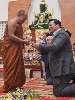 ท่านอ้นร่วมพิธีบายศรีสู่ขวัญตามประเพณีอีสานยังมีคณะสงฆ์ และมุกดาหารมี พระอาจารย์คำนวณ เจ้าอาวาสวัดป่าเทพนิมิตร.มุกดาหารได้มอบพระพุทธรูปแกะสลัก ด้วยไม้องค์สวยสง่างามมอบให้ท่านอ้นฯเพื่อเป็นสิริมงคลในโอกาสที่ท่านมาเยี่ยม พ่อแม่พี่น้องชาวอีสาน ยังมี พระอาจารย์ประยูร เจ้าอาวาสวัดป่าหินสิ่วจ.อำนาจเจริญ พร้อมคณะพระสงฆ์ จำนวนมากได้นำฝ้ายมาผูกแขนให้ท่านอ้นเพื่อเป็นสิริมงคลให้อยู่ดีมีสุขตามประเพณี ของชาวอีสานเมื่อมีผู้มาเยี่ยมเยียนหลังจากเสร็จสิ้นพิธีมอบอุปกรณ์ดังกล่าวแล้ว ห่มผ้าพระธาตุ เวียนเทียนรอบพระธาตุพนม ที่วัดพระธาตุพนมวรมหาวิหาร อ.ธาตุพนม จ.นครพนม ก่อนที่จะเดินทางไปบวงสรวงองค์พญาศรีสัตตนาคราช ยังเขตเทศบาลเมืองนครพนม อ.เมือง จ.นครพนม