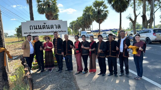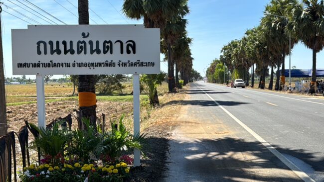 วันที่ 19 ธันวาคม 2566 ที่ ทุ่งนาข้างถนนต้นตาล สายอุทุมพรพิสัย – ปรางค์กู่ จังหวัดศรีสะเกษ สภาอุตสาหกรรมท่องเที่ยวจังหวัดศรีสะเกษ ได้จัดเวทีเสวนากลุ่มย่อย โดยมี นายนพ พงษ์ผลาดิสัย รองผู้ว่าราชการจังหวัดศรีสะเกษ, นายศราวุธ ทรงโฉม นายอำเภออุทุมพรพิสัย, นายวิทยา ไชยเดชกำจร นายอำเภอปรางค์กู่, นายนิรุจน์ เกษกุล นายกเทศบาลตำบลโคกจาน, นายสว่าง ดวงอาจ นายก อบต.ทุ่งไชย, นายสุพจน์ อรุณศรี นายช่างโยธาอาวุโส ผู้แทน ผอ.แขวงทางหลวงชนบทจังหวัดศรีสะเกษ,นายพงษ์พัฒน์ ไตรพิพัฒน์ ประธานสภาอุตสาหกรรมท่องเที่ยวจังหวัดศรีสะเกษ, นางวาสิตา น้อยพรหม นายกสมาคมธุรกิจการท่องเที่ยวจังหวัดศรีสะเกษ และผู้นำชุมชน แกนนำชาวบ้าน จากตำบลโคกจาน และตำบลทุ่งไชย พร้อมด้วย นางกฤษฎาวัลย์ สุริยุทธ บุตรสาวของพ่อดาบวิชัย สุริยุทธ ได้ร่วมวงเสนวนา โดยบุตรสาวของพ่อดาบวิชัยได้เน้นย้ำว่า ถนนสายนี้เป็นถนนแห่งความพากเพียร ความกตัญญู การเสวนาในหัวข้อ “ดาบวิชัย ต้องไม่ตาย” นั้นหมายความว่า เมื่อใดที่ทุกท่านเห็นต้นตาล ที่นายตำรวจคนหนึ่งที่ดาบวิชัย หรือ ร้อยตำรวจตรี วิชัย สุริยุทธ ปลูกไว้ตลอด 2 ข้างถนนบนพื้นที่ของจังหวัดศรีสะเกษ นับตั้งแต่ปี พ.ศ.2540 ที่พ่อดาบวิชัย ขับรถจักรยานยนต์ผ่าน ขณะเดินทางไปทำงานในหน้าที่ตำรวจ ได้แวะปลูกต้นตาลไว้ตลอด 2 ข้างถนน แม้วันนี้ดาบวิชัย จะเสียชีวิตไปแล้ว แต่ต้นตาลของพ่อดาบวิชัยยังอยู่ ทำอย่างไรที่พัฒนาขึ้นมาเป็นแหล่งท่องเที่ยว พัฒนาขึ้นมาให้ทุกคนในจังหวัดศรีสะเกษ รักษ์ต้นตาล รักษ์ต้นไม้ รักษ์ป่า ช่วยกันหวงแหนรักษา ต่อยอด ตลอดไปได้