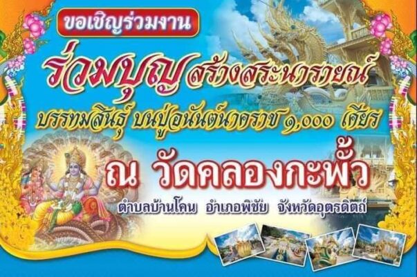 ผู้สื่อข่าวรายงานว่า ที่วัด คลองกะพั้ว ต.บ้านโคน อ.พิชัย จ.อุตรดิตถ์ พระอาจารย์ศักดิ์สิทธิ์ สีลเตโช รักษาการเจ้าอาวาสวัดคลองกะพั้ว อ.พิชัย จ.อุตรดิตถ์ นำคณะสื่อมวลชนเข้าชมบริเวณการดำเนินการขุดสร้างสระพระนารายณ์บรรทมสินธุ์ ประทับบนปู่อนันตนาคราช 1,000 เศรียร ซึ่งอยู่ภายในบริเวณวัดคลองกะพั้ว บนเนื้อที่ในการดำเนินการสร้าง ความกว้าง 15 เมตรลึก 2เมตร 50 เซนติเมตร โดยการสร้างรูปปั้นจำลองพระนารายบรรทมสินธิ์ุ ประทับบนพ่อปู่อนันตนาคราช 1,000เศียร ซึ่งจะมีความสูงประมาณ 6 เมตรรวมฐานที่ตั้ง ประดิษสถานบริเวณภายในวัดคลองกะพั้ว เพื่อให้สาธุชนผู้มีจิตศรัทธาต่อพระนารายณ์บรรทมสินธิ์และปู่อนันตนาคราช ตลอดถึงสาธุชนทั่วไปได้เข้ามากราบไว้สักการะบูชา เพื่อความเป็นสิริมงคล