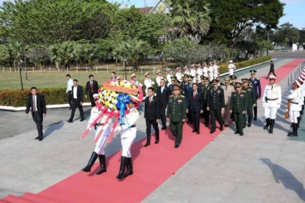 จากนั้น รมว.กห. และคณะ ได้เดินทางไปวางพวงมาลา ณ อนุสาวรีย์นักรบนิรนาม ซึ่งเป็นอนุสาวรีย์ที่สร้างขึ้น เพื่อแสดงถึงความเคารพและระลึกถึงความเสียสละในการต่อสู้เพื่อปกป้องประเทศชาติ ก่อนที่จะไปยังห้องว่าการรัฐบาล เพื่อเข้าเยี่ยมคำนับ นายสอนไซ สีพันดอน นรม.สปป.ลาว โดย รมว.กห. ได้กล่าวขอบคุณที่ให้เข้าเยี่ยมคำนับ ซึ่งถือเป็นเกียรติและภูมิใจที่ได้มา ในส่วนการเดินทางมาเยือนในครั้งนี้ ก็เพื่อสานต่อความสัมพันธ์ของทั้งสองประเทศให้มากยิ่งขึ้น เพราะว่าทั้งสองประเทศนั้นมีความผูกพันกันมาอย่างยาวนาน ประชาชนไปมาหาสู่กันโดยตลอด อย่างไรก็ตาม ทั้งสองประเทศยังคงมีปัญหาที่จะต้องร่วมมือกันแก้ไข อาทิ ปัญหาอาชญากรรมข้ามชาติ และการพัฒนาพื้นที่ชายแดน ที่จะต้องเสริมสร้างให้เป็นจุดแข็งทางเศรษฐกิจร่วมกัน เพื่อทำให้ประชาชนสามารถประกอบอาชีพได้โดยสะดวก ซึ่งเชื่อมั่นว่าความร่วมมือที่มีระหว่างกัน จะสามารถแก้ไขปัญหาและพัฒนาด้านต่างๆ ได้มากขึ้น ขณะที่ นรม.สปป.ลาว ได้กล่าวเห็นด้วยกับ รมว.กห. ซึ่งทั้งสองประเทศจะต้องมีความร่วมมือกันในการทำให้พื้นที่ชายแดนมีความสงบสุข และประชาชนของทั้งสองประเทศมีมิตรภาพที่ดีต่อกัน รวมถึงช่วยเหลือเกื้อกูลซึ่งกันและกัน เพื่อให้มีความเจริญก้าวหน้า จนสามารถแก้ไขปัญหาด้านความมั่นคงไปพร้อมๆ กันได้ ในโอกาสนี้ นรม.สปป.ลาว ยังได้กล่าวแสดงความยินดีที่นาย สุทิน คลังแสง ได้รับการแต่งตั้งให้ดำรงตำแหน่ง รมว.กห. อีกด้วย