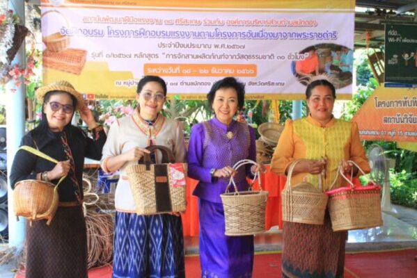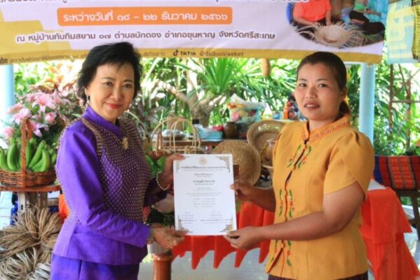 เมื่อวันที่ 22 ธันวาคม 2566 ที่หมู่บ้านทับทิมสยาม07 ตำบลบักดอง อำเภอขุนหาญ จ.ศรีสะเกษ ดร.กัลยาณี ธรรมจารีย์ นายกสมาคมส่งเสริมเครือข่ายการท่องเที่ยวจังหวัดศรีสะเกษ เป็นประธานมอบวุฒิบัตรให้แก่ผู้ผ่านการฝึกอบรมโครงการตามแนวทางอันเนื่องมาจากพระราชดำริ รุ่นที่ 1/2567 หลักสูตรการฝึกอาชีพเสริม การจักสานผลิตภัณฑ์จากวัสดุธรรมชาติ 30 ชั่วโมง ภายใต้โครงการพัฒนาฝีมือแรงงาน สร้างงาน สร้างรายได้ ชุมชนเข้มแข็ง ซึ่งสถาบันพัฒนาฝีมือแรงงาน 38 ศรีสะเกษ โดยนายชัยรัตน์ ฉัตรศุภกุล ผู้อำนวยการสถาบันพัฒนาฝีมือแรงงาน 38 ศรีสะเกษ ได้มอบหมายให้ นางสาวณภัค จักรางกูรวโรดม นักวิชาการพัฒนาฝีมือแรงงานชำนาญการ ผู้อำนวยการกลุ่มงานแผนงานและสารสนเทศเป็นผู้แทนกล่าวรายงาน โดยมีนางสุพิน ศรีเลิศ พนักงานธุรการ ระดับ ส 4 นายบันเทิง นาคญวน พนักงานราชการสำนักบริหารพื้นที่อนุรักษ์ที่ 9 จังหวัดอุบลราชธานี และนางสายสมร พาบุตร ผู้ใหญ่บ้าน หมู่บ้านทับทิมสยาม07 เป็นวิทยากรนำผู้เกี่ยวข้องในหมู่บ้าน และมีผู้ผ่านการอบรมเข้ารับมอบวุฒิบัตร จำนวน 20 คน ทั้งนี้เพื่อผู้เข้ารับการฝึกอบรมได้มีความรู้ความสามารถเกี่ยวกับการฝึกอาชีพเสริม การจักสานผลิตภัณฑ์จากวัสดุธรรมชาติ สามารถนำความรู้กลับไปประกอบอาชีพอิสระเลี้ยงครอบครัวและตนเองได้อย่างยั่งยืน ต่อไป