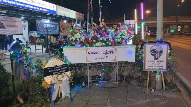 เจ้าหน้าที่กู้ภัยสว่างพรกุศลระยอง ตั้งโลงศพจำลองพร้อมกับประดับไฟ