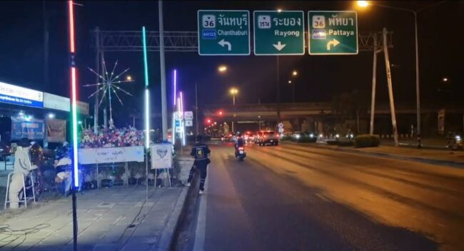 เจ้าหน้าที่กู้ภัยสว่างพรกุศลระยอง ตั้งโลงศพจำลองพร้อมกับประดับไฟ แสงสี เหมือนตั้งศพสวดอภิธรรมบริเวณสี่แยก เตือนสติผู้ขับขี่เมาแล้วขับ อาจกลับ ไม่ถึงบ้านช่วง 7 วันอันตราย