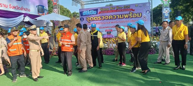 เมื่อวันที่ 29 ธ.ค. 2566 ที่ จ.ลำปาง ผู้สื่อข่าวรายงานว่า ที่ข้างวัดศรีภูมิ ตรงข้ามด่านตรวจยาเสพติด สภ.สบปราบ จ.ลำปาง นายชนาธิป เสมแย้ม รองผู้ว่าราชการจังหวัดลำปาง ประธานพิธีเปิดจุดตรวจความพร้อมรถโดยสารสาธารณะและพนักงานขับรถ ช่วงเทศกาลปีใหม่ พ.ศ. 2567 พร้อมด้วยนายจักรกฤษ ตั้งใจตรง ผู้ตรวจราชการกรมการขนส่งทางบก นายเกษม ใจจันทร์ นอภ.สบปราบ น.ส.สุชาดา พฤกษะวัน ขนส่งจังหวัดลำปาง พ.ต.อ.ณัฐญ์วสุภ์ แสงณิรัฒศัย ผกก.สภ.สบปราบ นายวัชรินทร์ อุปะโยคิน นายกเทศมนตรีตำบลสบปราบ ผู้แทน มทบ.32 ตำรวจทางหลวงลำปาง หัวหน้าส่วนราชการ สถานศึกษา สมาคมกู้ภัยลำปาง มร.ลำปาง รงพยาบาลสบปราบ คปภ.ลำปางและเจ้าหน้ที่ขนส่งจังหวัดลำปางเข้าร่วมในพิธี