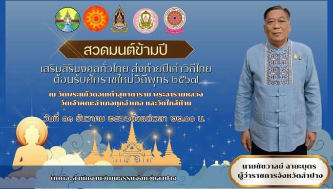 เมื่อวันที่ 31 ธ.ค.2566 ที่ จ.ลำปาง ผู้สื่อข่าวรายงานว่า พระจินดารัตนาภรณ์ เจ้าคณะจังหวัดลำปาง (มหานิกาย)เจ้าอาวาสวัดพระแก้วดอนเต้าฯ พระวิสุทธิวชิรวิมล เจ้าคณะจังหวัดลำปาง (ธรรมยุต)เจ้าอาวาสวัดสามัคคีบุญญาราม อ.เมืองลำปาง และน่ยชัชวาลย์ ฉายะบุตร ผู้ว่าราชการจังหวัดลำปางขอเชิญชวนพุทศาสนิกชนทั่วไปร่วม กิจกรรมสวดมนต์ข้ามปีในจังหวัดลำปาง ในเวลา 22.00 น.วันที่ 31 ธ.ค.2566– 1 ม.ค.2567 โดยมีวัดต่างๆ ดังนี้