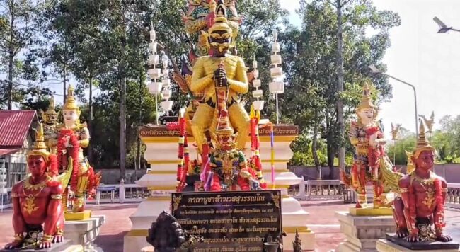 พระครูสุธรรมปัญญาวุธออกบิณฑบาตโปรดญาติโยมเดินผ่านที่ตั้งประดิษฐานองค์ท้าวเวสสุวรรณทั้ง 4 ทิศพบแตนมาทำรังที่ใต้คางองค์ท้าวเวสสุวรรณชาวบ้านทราบข่าวแห่ขอเลขเด็ดใกล้วันหวยออก