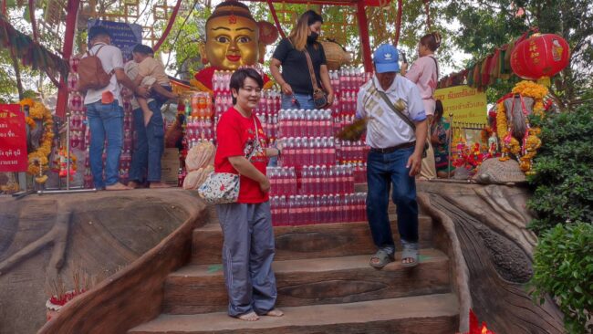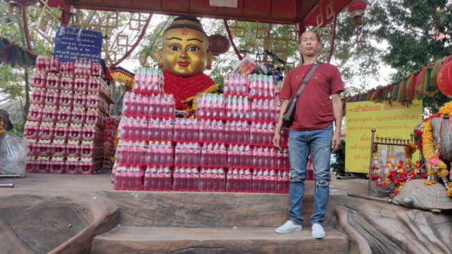 จากการสอบถาม นาย สมชาย บ่อแก้ว อายุ 50 ปี พ่อค้าชาวจังหวัดนครปฐม ที่เดินทางนำน้ำแดง 59 มาแก้บนหลังได้โชคกว่าแสนบาท โดยนายสมชายกล่าวว่า วันนี้เอาน้ำแดงมาแก้บน 59 แพ็ค โดยได้โชคจากธูปเลขมงคลที่มาครั้งที่แล้ว ได้โชครับเงินหนึ่งแสนบาทแล้วมาครั้งนี้ก็ได้ขอให้เฮงเฮงอีกในครั้งต่อไป