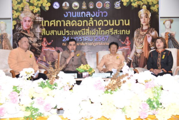 เมื่อวันที่ 24 มกราคม 2567 ที่ห้องประชุมศรีวรรณ เกียรติสุรนนท์ มหาวิทยาลัยราชภัฏศรีสะเกษ นายอนุพงศ์ สุขสมนิตย์ ผู้ว่าราชการจังหวัดศรีสะเกษ พร้อมด้วย นายวิชิต ไตรสรณกุล นายก อบจ.ศรีสะเกษ ผศ.ดร.ประกาศิต อานุภาพแสนยากร รองอธิการบดีมหาวิทยาลัยราชภัฏศรีสะเกษ และนางศรีสุภรณ์ ชมศรีหาราชพร ผอ.ททท. สุรินทร์-ศรีสะเกษ ได้ร่วมกันแถลงข่าวเทศกาลดอกลำดวนบานสืบสานประเพณีสี่เผ่าไทศรีสะเกษ ประจำปี2567 ซึ่งจังหวัดศรีสะเกษร่วมกับองค์การบริหารส่วนจังหวัดศรีสะเกษ มหาวิทยาลัยราชภัฏศรีสะเกษ ภาครัฐ ภาคเอกชน และประชาชนชาวจังหวัดศรีสะเกษ ร่วมกันจัดขึ้นในระหว่างวันที่ 6-10 มีนาคม 2567 ที่สวนสมเด็จพระศรีนครินทร์ศรีสะเกษ อำเภอเมืองศรีสะเกษ โดยมีนายอภิศักดิ์ แซ่จึง นายวิเชียร ถิระเลิศพานิชย์ นายมานะพันธ์ อังคสกุลเกียรติ รองนายก อบจ.ศรีสะเกษ และนายวิทยา วิรารัตน์ ประธาสภาวัฒนาธรรมจังหวัดศรีสะเกษ นำหัวหน้าส่วนราชการจังหวัดศรีสะเกษ ข้าราชการและสื่อมวลชนจังหวัดศรีสะเกษ ร่วมรับฟังการแถลงข่าว เป็นจำนวนมาก