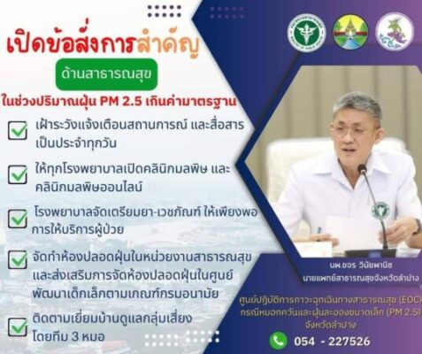 ทางด้าน นพ.ขจร วินัยพานิช นายแพทย์สาธารณสุขจังหวัดลำปาง ประชุมคณะทำงานศูนย์ปฏิบัติการภาวะฉุกเฉินทางสาธารณสุข (Emergency Operation Center :EOC) กรณีหมอกควันและฝุ่นละอองขนาดเล็ก (PM 2.5) ได้เปิดศูนย์ปฏิบัติการภาวะฉุกเฉินทางสาธารณสุข (EOC) กรณีหมอกควันและฝุ่นละอองขนาดเล็ก (PM 2.5) จังหวัดลำปาง และได้มีข้อสั่งการให้หน่วยงานสาธารณสุขในสังกัดดำเนินการ ดังต่อไปนี้