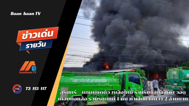 สุรินทร์ – เกิดเหตุเพลิงไหม้ ร้านรับซื้อของเก่า ริมถนนปัทมานนท์ เส้นทาง อ.ท่าตูม – อ.จอมพระ หมู่ที่ 19 ต.เมืองแก อ.ท่าตูม จ.สุรินทร์ วอดเกือบทั้งหลัง รวมรถยนต์ 1 คัน ค่าเสียหายกว่า 2 ล้านบาท