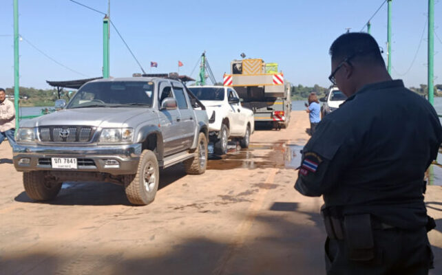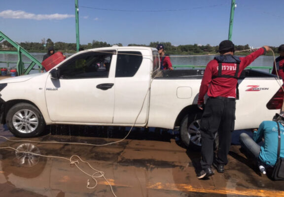 วันที่ 2 ก.พ เวลา 14:00 น ที่กลางลำแม่น้ำโขงค่อยมาฝั่งไทย หน้าวัดป่าบ้านพันลำ อ.เมืองบึงกาฬ จ.บึงกาฬ น.ท.ธนชัย รอดทัศนา หน.สน.เรือบึงกาฬ ได้สั่งการให้ ร.ท.ไชยา เนียมแสง ผู้ควบคุมเรือตรวจการณ์ นำเรือเร็วออกไปอำนวยความสะดวกในการกู้ซากรถยนต์กระบะยีห้อโตโยต้าแคป รุ่นรีโว่ สีขาว ทะเบียน 3ฒฎ 5569 กรุงเทพมหานคร พร้อมกับ นายบรรเจิด ตันตะละ รษก.แทนนายด่านศุลกากรบึงกาฬ มอบหมายให้ นางสาวเบญจ์ ชำกรม นักวิชาการศุลกากรชำนาญการ ตำรวจน้ำบึงกาฬ ด่านตรวจคนเข้าเมืองบึงกาฬ และมงคล แซ่โค้ว เจ้าของแพขนานยนต์เกิดเหตุ นำรถเครนขนาด 25 ตันลงแพออกไปยกรถกระบะคันตำน้ำโขง ซึ่งอยู่ห่างจากท่าเรือประมาณ 200 เมตร และรถจมน้ำอยู่ในระดับความลึกของน้ำโขงประมาณ 5 เมตร โดยใช้เวลาประมาณ 1 ชั่วโมงก็สามรถยกรถขึ้นจากน้ำมาได้ บรรทุกขึ้นแพกลับเข้าฝั่งได้สำเร็ว โดยสภาพทั่วไปรถยนต์คันดังกล่าวอยู่ในสภาพเสียหายเล็กน้อย แต่สำหรับเครื่องยนต์ต้องตรวจเช็คอย่างละเอียดว่ามีส่วนใดเสียหายบ้าง เนื่องจากขณะตกจากแพเครื่องยนต์ยังติดอยู่
