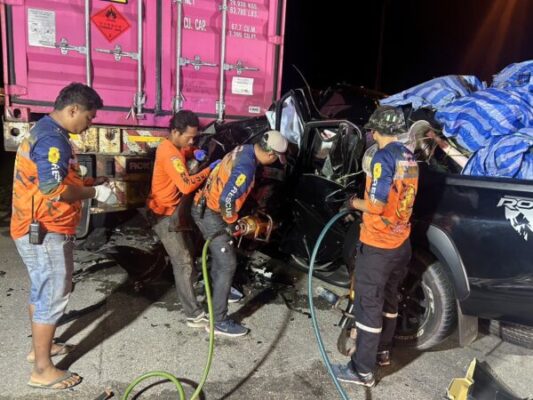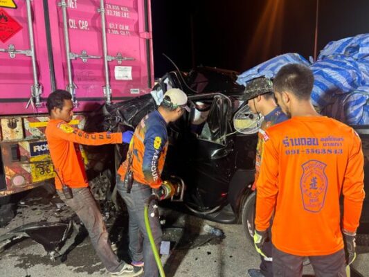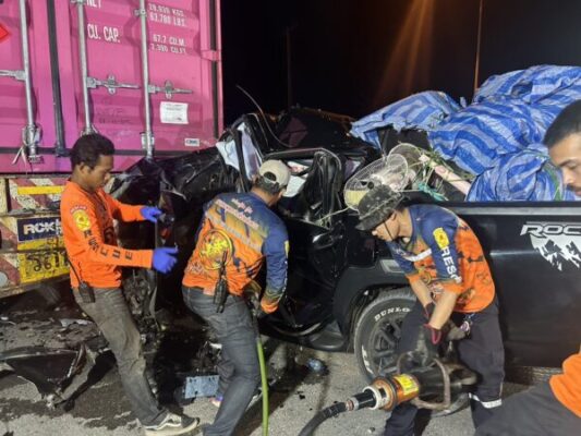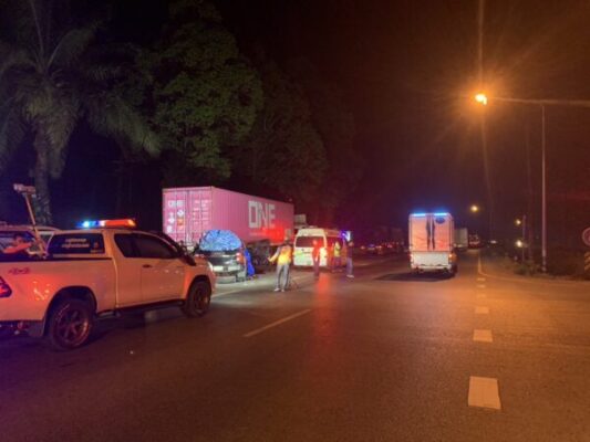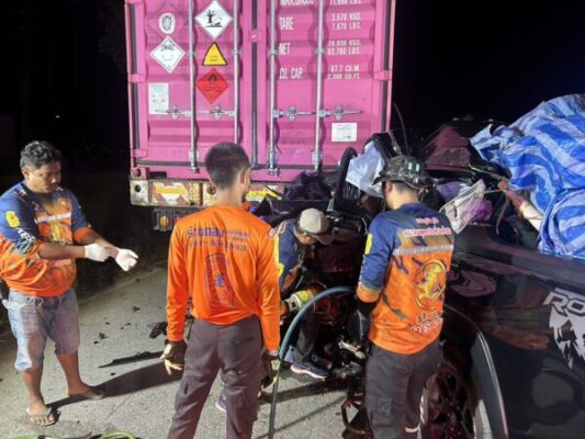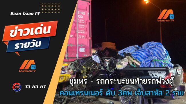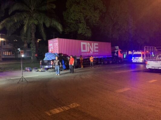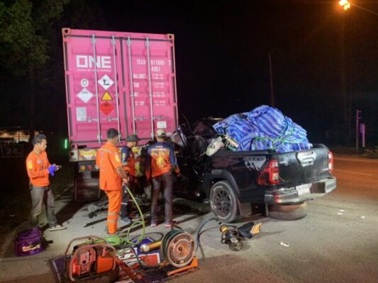ชุมพร – รถกระบะชนท้ายรถพ่วงตู้คอนเทรนเนอร์ ดับ 3ศพ เจ็บสาหัส 2 ราย