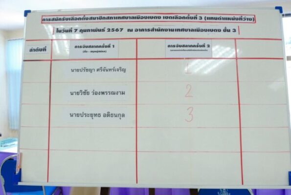 นายอรรถพงษ์ แวสืนิ ผู้อำนวยการการเลือกตั้งประจำเทศบาลเมืองเบตง กล่าวว่า ตามที่ สำนักงานคณะกรรมการการเลือกตั้งประจำจังหวัดยะลา เห็นชอบประกาศให้มีการเลือกตั้งสมาชิกสภาเทศบาลเมือง เบตง เขตเลือกตั้งที่ 3 (แทนตำแหน่งที่ว่าง) จึงประกาศให้มีการเลือกตั้งสมาชิกสภาเทศบาลเมืองเบตง เขตเลือกตั้งที่ 3 แทนตำแหน่งที่ว่างลง เมื่อวันที่ 31 มกราคม 2567 โดยให้จัดการเลือกตั้งสมาชิกสภาเทศบาลเมืองเบตง ในวันอาทิตย์ที่ 17 มีนาคม 2567 ซึ่งในวันนี้มีผู้สมัครเลือกตั้งสมาชิกสภาเทศบาลเมือง เบตง เขตเลือกตั้งที่ 3 (แทนตำแหน่งที่ว่าง)จำนวน 3 คน ดังนี้ นายปรัชญา ศรีจันทร์เจริญ เป็นผู้จับได้ หมายเลข 1 / นายวิชัย ว่องพรรณงาม เป็นผู้จับได้หมายเลข 2 และนายประยุทธ อดิธนกุล เป็นผู้จับได้หมายเลย 3