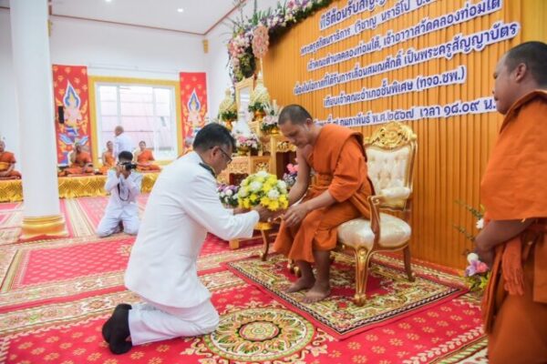 วันที่ 7 กุมภาพันธ์ 2567 เวลา 18.09 น. วัดคลองท่อม อำเภอคลองท่อม จ.กระบี่ นายไพศาล ศรีเทพ นายอำเภอคลองท่อม ประธานในพิธีฝ่ายฆราวาส จุดรูปเทียนบูชาพระรัตนตรัย เปิดกรวยสักการะพระบรมฉายาลักษณ์พระบาทสมเด็จพระเจ้าอยู่หัวฯ และอ่านตราตั้งเลื่อนสมณศักดิ์พระครูสัญญาบัตร เทียบเจ้าคณะอำเภอชั้นพิเศษ (ทจอ.ชพ) จากนั้นพระสงฆ์สมณศักดิ์ 18 รูป เจริญชัยมงคลคาลา และแขกผู้มีเกียรติร่วมถวายจตุปัจจัยไทยธรรม