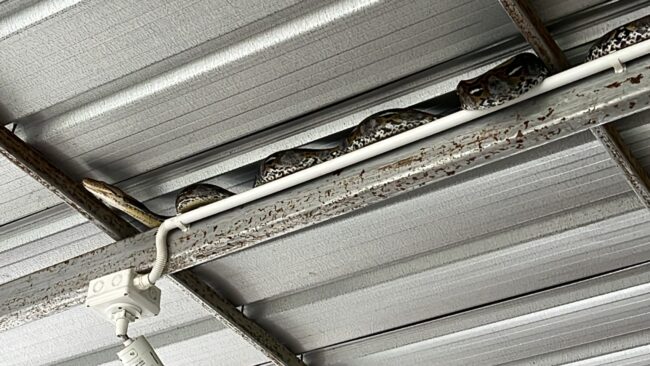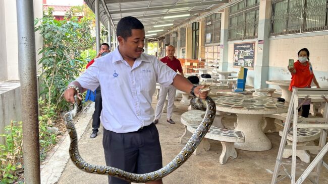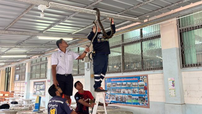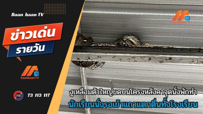 งูเหลือมตัวใหญ่ขดบนโครงหลังคาจุดนั่งพักทำนักเรียนนั่งรอเข้าแถวแตกตื่นทั้งโรงเรียน