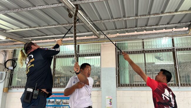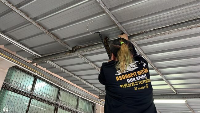 งูไว้ได้นำลงมาได้สำเร็จ ซึ่งระหว่างจับงูนั้นผู้สื่อข่าวได้สังเกตุเห็นมีน้องนักเรียนชายได้มาช่วยทีมอสรพิษในการจับงูด้วย จึงได้พูดคุยสอบถามทราบชื่อคือนายปกป้อง บิลซาเล็ม นักเรียนชั้นม.6 ได้เล่าว่าตนเองชอบงานอาสาสมัครและชอบออกไปช่วยพี่ๆกู้ภัยในการจับงูบ่อยครั้ง เมื่อมีงูเข้ามาในโรงเรียนตนเองเรียนก็เลยมาช่วยพี่ๆในการจับงู