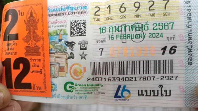 คิดว่าแปลกจึงได้มีการจุดธูปบอกเจ้าที่และขอเลขเด็ดจากต้นมะละกอ และใช้แป้งทาที่ลำต้นและลูกมะละกอ หลังจากใช้แป้งลูกทาที่ลูกมะละกอเห็นเป็นตัวเลข 127 โดยตีเป็นตัวเลขมาจากมะละกอ 1 ต้นแตกกิ่งออกมาเป็นมะละกอยอดด้วน มีลูก27ลูก และได้ไปหาซื้อลอตเตอรี่เป็นหวยชุด 2 ใบเลข216927 จึงตัดสินใจซื้อลอตเตอรี่หวยชุดเลข216927มาเสี่ยงโชคงวดประจำวันที่ 16 กพ.67จำนวน 2 ใบ