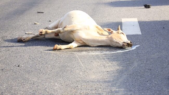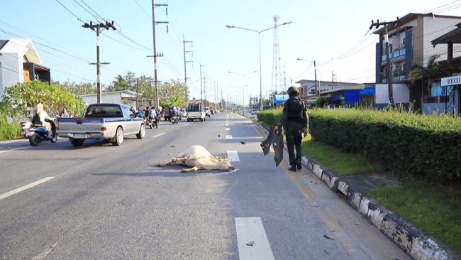 ห่างออกไปเล็กน้อย พบวัว เพศผู้ น้ำหนักกว่า 100 กก. ซึ่งวิ่งมาชนรถนอนหายใจรวยรินอยู่บนถนน และเสียชีวิตในเวลาต่อมา