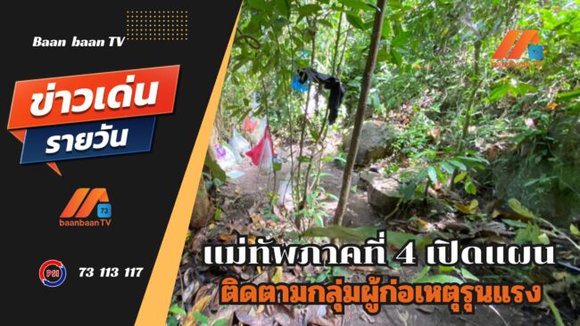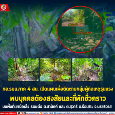 กอ.รมน.ภาค 4 สน. เปิดแผนเพื่อติดตามกลุ่มผู้ก่อเหตุรุนแรง พบบุคคลต้องสงสัยและที่พักชั่วคราว บนพื้นที่เขาบือเล็ง รอยต่อ ต.สามัคคี และ ต.สุวารี อ.รือเสาะ จ.นราธิวาส