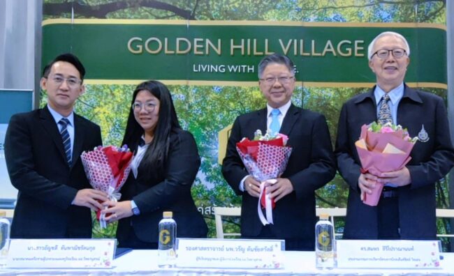 นายสมพร สิริโปราณานนท์ ประธานกรรมการบริหารโครงการโกลเด้นท์ ฮิลล์ วิลเลจกล่าวว่า สำหรับโครงการโกลเด้นท์ ฮิลล์ วิลเลจนี้ ตั้งอยู่ตรงข้ามเซ็ลทรัลเฟสหลังแม็คโคร อยู่ห่างจากโรงเรียนมอ.วิทยานุสรณ์ประมาณ 2 กิโลเมตร มีเนื้อที่แบ่งเป็นหลายๆ เฟสมีเฟซที่ 1 ถึงเฟส 7 เฟสที่ 1 มีพื้นที่ประมาณ 5 ไร่ ขณะนี้ขายหมดแล้วส่วนเฟสที่ 2 ที่ 3 เนื้อที่ 10 ไร่ ตอนนี้กำลังเริ่มเฟสที่ 4 เฟสที่ 5 และเฟสที่ 6 ซึ่งเป้าหมายที่ดินก็ได้ซื้อไว้แล้ว เพื่อทำเฟสที่ 7 โดยรวมทั้ง 7 เฟสจะมีเนื้อที่ทั้งหมดประมาณ 120 ไร่ ซึ่งตนตั้งใจไว้ว่าหมู่บ้านที่จะสร้างทั้งหมดประมาณ 600 ถึง 700 หลัง ทั้ง 7 เฟส มีทั้งบ้านเดี่ยว บ้านแฝด บ้านชั้นเดียว บ้านเดี่ยว 2 ชั้น บ้านทาวน์โฮม 2-3 ชั้น นอกจากนี้ยังมีร้านค้า มีสปอร์ตคลับ มีสวนหย่อม และเนื้อที่ส่วนที่เหลือก็จะสร้างเป็นโรงแรมระดับ 4-5 ดาว เพื่อเป็นการส่งเสริมการท่องเที่ยวและยกระดับโรงแรมในเมืองหาดใหญ่ ซึ่งตนเคยเป็นประธานหอการค้ามาก่อน และยังเป็นผู้ปกครองรุ่นแรกของโรงเรียน มอ.วิทยานุสรณ์ฉะนั้นจึงมองเห็นศักยภาพของผู้ปกครองและของนักเรียนก่อนหน้านี้ ซึ่งมีศักยภาพที่ดีและสิ่งแวดล้อมที่ดีให้กับลูกหลานของโรงเรียนนี้ จึงมาทำ MOU ระหว่างสมาคมเครือข่ายผู้ปกครองและครู กับโครงการการ์เด้นท์ ฮิลล์ วิลเลจ เพื่อมอบสิ่งแวดล้อมที่ดีให้กับลูกหลานพร้อมสิ่งอำนวยความสะดวกและปลอดภัยที่สุด เราดูแลตั้งแต่ลูกหลานอยู่ที่บ้านจนออกมาโรงเรียน เราดูแลเต็มที่เพราะรู้ว่าผู้ปกครองส่วนใหญ่ 40% จะมาจากต่างจังหวัดจึงเกิดความกังวล เพราะโรงเรียนก็มีที่พักไม่มาก ตรงนี้จึงถือเป็นทางเลือกทางหนึ่ง โรงเรียน มอ.วิทยานุสรณ์นี้เราได้ทำกิจกรรมร่วมกันมาปีนี้เป็นปีที่ 10 เราบอกลูกหลานของเราว่าโรงเรียนนี้เป็นบ้านแห่งที่ 2 ดังนั้นเราอยู่แบบครอบครัวใหญ่ จึงต้องมีความรักให้ซึ่งกันและกัน วันนี้เป็นวันวาเลนไทน์เป็นวันที่ดีและเป็นสัญลักษณ์ที่ดี เราจึงเอาวันแห่งความรักนี้มามอบความรักให้กับลูกหลานทุกคนของเราทุกคน