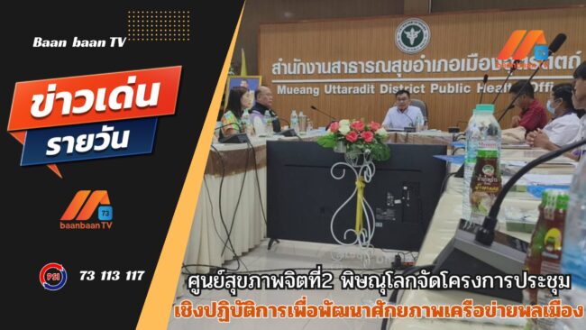 โดยมีนายชูพงษ์ สังขผลิพันธ์ ผู้อำนวยการศูนย์สุขภาพจิตที่2 พิษณุโลก นายสมศักดิ์ มีอ่วม สาธารณสุขอำเภอเมืองอุตรดิตถ์ นายสุขเสริมทิพย์ปัญญา นักวิชาการสาธารณสุขชำนาญการ น.ส.สาวิตรี ฉิมหัวร้อง นักวิชาการสาธารณสุขปฏิบัติการ นายณัฐวัฒน์ ราชประสิทธิ์ ผู้ประสานงานเครือข่ายสื่อมวลชนสุขภาพจิตจังหวัดอุตรดิตถ์พร้อมสื่อมวลชนสุขภาพจิต อกนนำนักศึกษา อาสาสมัครสาธารณสุขประจำหมู่บ้าน บุคลากรจากสำนักงานสาธารณสุขอำเภอ สำนักงานสาธารณสุขจังหวัด จำนวน 21 คนเข้าร่วมในพิธีเปิดโครงการประชุมเชิงปฏิบัติการเพื่อพัฒนาศักยภาพเครือข่าย