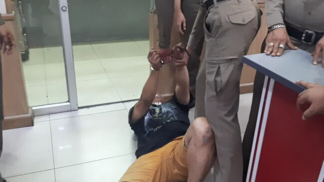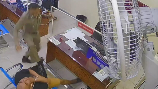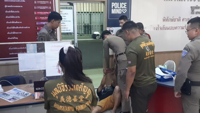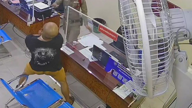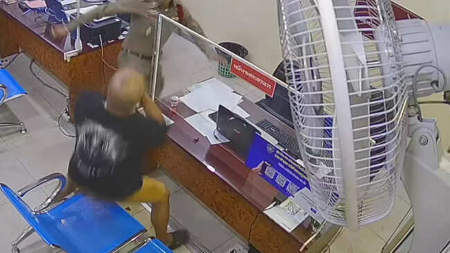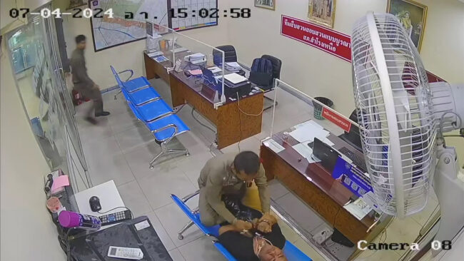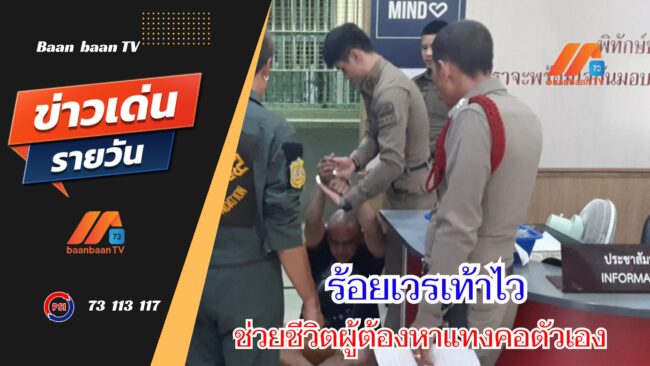ร้อยเวรเท้าไวถีบช่วยชีวิตผู้ต้องหาที่ใช้เศษขวดแก้วแทงคอตัวเอง