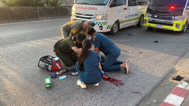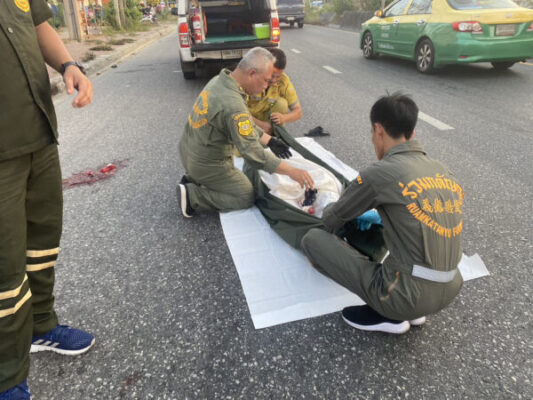ที่เกิดเหตุ บนถนนเลนซ้าย พบ รถจักรยานยนต์ ยามาฮ่า อาร์ 15 สีดำ ทะเบียน 1 กณ 3718 ลำปาง ล้มคว่ำอยู่กลางถนน ห่างออกไป พบ นาย พิวมินไล อายุ 37 ปี ชาวเมียนมา ซึ่งเป็นคนขับ นอนแน่นิ่งจมกองเลือด เจ้าหน้าที่กู้ชีพให้การช่วยเหลือปั้มหายใจ อยู่ประมาณ 15 นาที แต่ไม่เป็นผล ทนพิษบาดแผลไม่ไหวเสียชีวิตในที่เกิดเหตุ ใกล้กันพบ นาย หวาย ยาน ฟิว คนซ้อนท้าย ได้รับบาดเจ็บอาการสาหัส เจ้าหน้าที่ให้การช่วยเหลือปฐมพยาบาลเบื้องต้นก่อนเร่งนำส่งโรงพยาบาลจุฬารัตนน์ 3 อินเตอร์ ในที่เกิดเหตุ พบหมวกกันน็อก ชนิดเต็มใบ แตกกระจายอยู่ที่พื้นถนน เนื่องจากทำจากพาสตอกไม่ได้มาตรฐาน