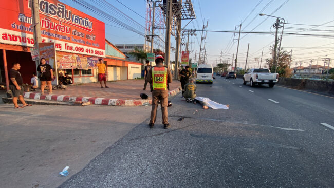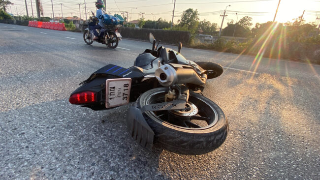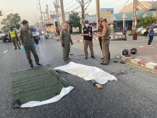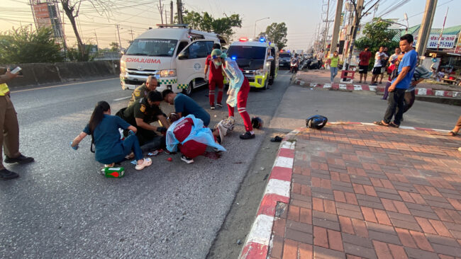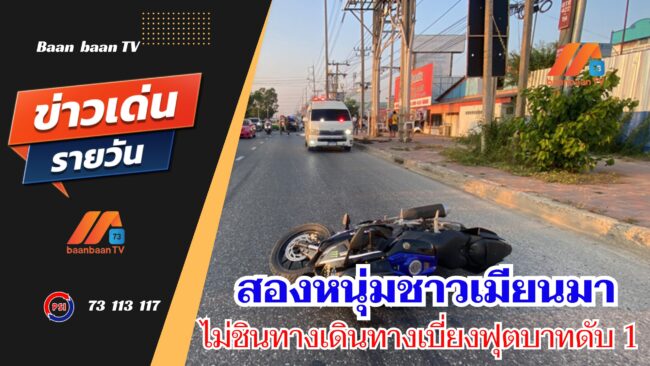 สองหนุ่มชาวเมียนมา ไม่ชินทางซิ่งจักรยานยนต์ เจอทางเบี่ยงชนฟุตบาท ดับ 1 เจ็บ 1