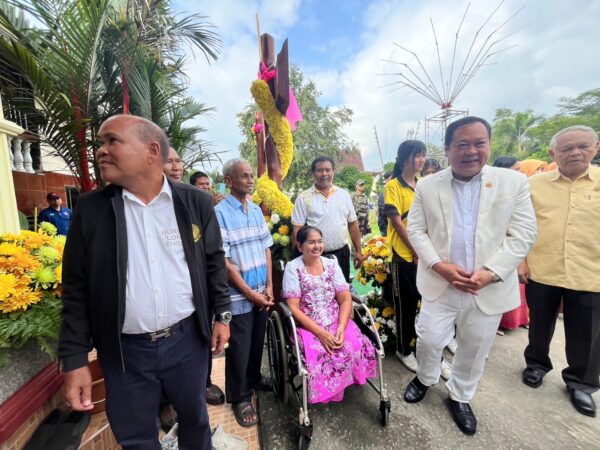 ขณะเข้าไปกรีดยางในสวนยางพาราแล้วเหยียบกับระเบิดที่คนร้ายลอบวางไว้ วันนี้ นางประทุม นักทอง ได้นั่งรถเขนนำครอบครัวมาร่วมสวัสดีปีใหม่และขอพรจาก พ.ต.อ.ทวี สอดส่อง รมว.ยุติธรรม ด้วย
