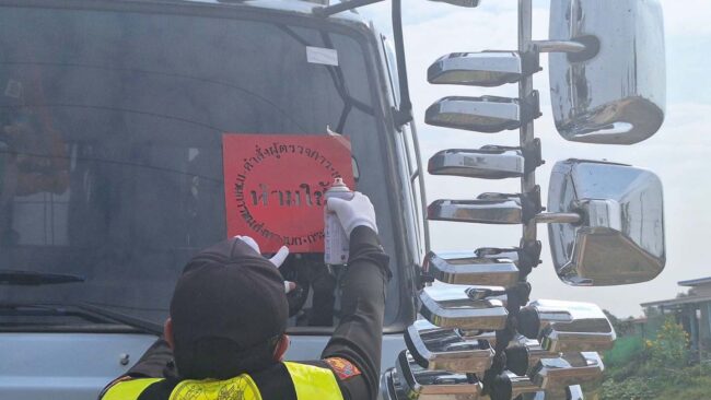นางสาวพัชรีวรรณ หอมหวล หัวหน้ากลุ่มวิชาการขนส่ง กล่าวว่า วันนี้ได้ลงตรวจรถควันดำ มีรถเกินค่าควันดำ 1 คัน กฎหมายกกำหนดค่าควันดำที่กระทำความผิดเกิน 30 มิลิกรัม หรือ 30 เปอร์เซ็นต์ และพ่นสเปร์สีแดงห้ามใช้ที่กระจกหน้ารถ เนื่องจากค่าควันดำอยู่ที่ 49 เปอร์เซ็นต์ หลังจากที่ห้ามให้กระทำความผิดแล้ว ในส่วนของควันดำรถที่กระทำความผิด จะต้องนำรถไปแก้ไขตัวรถให้เรียบร้อย และนำรถเข้าไปตรวจที่สำนักงานขนส่งอีกครั้งเพื่อให้ค่าควันดำลดลง และต้องดำเนินการเสียค่าปรับด้วยจำนวน 5,000 บาท ถ้าตรวจผ่านเรียบร้อยแล้วต้องลบห้ามใช้ออก สามารถนำรถไปใช้งานได้ตามปกติ