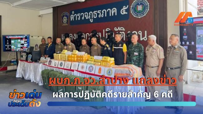 เมื่อเวลา 11.30 น. วันที่ 24 ก.พ. 2568 ที่ จ.ลำปาง ผู้สื่อข่าวรายงานว่า ณ อาคาร บก.สส.ภ.5 จ.เชียงใหม่ พล.ต.ต.ภูมิปัญญ์ญา นวตระกูลพิสุทธิ์ ผบก.ภ.จว.ลำปาง พ.ต.อ. ณัฐญ์วสุภ์ แสงณิรัฒศัย ผกก.สภ.สบปราบ จ.ลำปาง ร่วมแถลงข่าวผลการปฏิบัติคดีรายสำคัญ 6 คดีโดยมี พล.ต.ท.กฤตธาพล ยี่สาคร ผบช.ภ.5 เป็นประธานการแถลงข่าว พร้อมด้วย พล.ต.ต.พิชญา บุญขจร พล.ต.ต.ธวัชชัย พงษ์วิวัฒนชัย รอง ผบช.ภ.5 และทหาร เจ้าหน้าที่ฝ่ายปกครอง หน่วยงาน ป.ป.ส.และเจ้าหน้าที่ที่เกี่ยวข้อง ร่วมแถลง