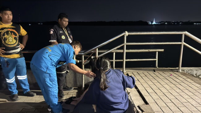 เมื่อเวลา 21.20 น.วันที่ 24 กุมภาพันธ์ 2568 เจ้าหน้าที่หน่วยกู้ภัยมูลนิธิร่มกุศลสมุทรปราการ สมาคมกู้ภัยสมุทรปราการ พร้อมด้วยหน่วยกู้ชีพเทศบาลนครสมุทรปราการ ได้รับแจ้งเหตุมีหญิงพยายามจะทำร้ายตัวเองโดยการจะกระโดดลงแม่น้ำเจ้าพระยา ภายในศาลากลางจังหวัดสมุทรปราการ ตำบลปากน้ำ อำเภอเมือง จังหวัดสมุทรปราการ จึงนำกำลังเดินทางเข้าตรวจสอบ