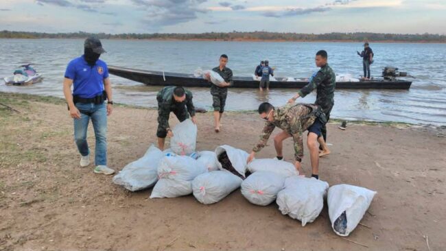 เมื่อวันที่ 23 กุมภาพันธ์ 2568 ที่ผ่านมา กองร้อยหมวดสกัดกั้นฯที่ 1 กองกำลังสุรศักดิ์มนตรี ได้รับแจ้งจากแหล่งข่าวว่า จะมีการลักลอบขนสินค้าผ่านช่องทางธรรมชาติข้ามมายังฝั่งประเทศไทย จึงรายงานให้ผู้บังคับบัญชาทราบ และวางแผนทำการจับกุมร่วมกับกองร้อยทหารราบ และกองร้อยเฉพาะกิจทหารพรานที่ 2105 ออกตรวจในพื้นที่ หมู่ 2 บ.หว้านน้อย ต.หว้านใหญ่ อ.หว้านใหญ่ จ.มุกดาหาร พบเรือกีบเหล็กติดเครื่องยนต์แล่นจากฝั่ง สปป.ลาว เข้ามายังท่าน้ำฝั่งประเทศไทย และมองเห็นวัตถุต้องสงสัยเป็นกระสอบสีขาวจำนวนหลายใบอยู่ในเรือ
