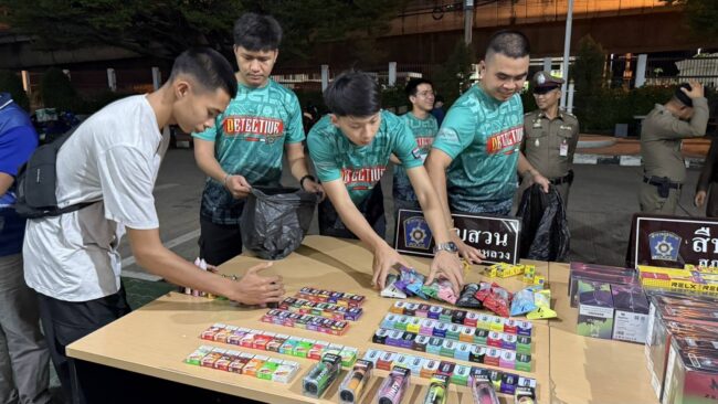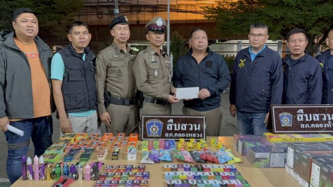 พล.ต.ต.ยุทธนา จอนขุน ผบก.ภ.จว.ปทุมธานี กล่าวว่า ตำรวจภูธรจังหวัดปทุมธานี ได้ดำเนินการตามข้อสั่งการ ดังกล่าว โดยสืบเนื่องเนื่องจากจังหวัดปทุมธานีเป็นพื้นที่ตั้งของมหาวิทยาลัยขนาดใหญ่อยู่ถึง 4 มหาวิทยาลัย จึงได้กำหนดเป็นพื้นที่เป้าหมายสำคัญเพื่อป้องกันการจำหน่ายบุหรี่ไฟฟ้าดังกล่าว ดังนั้นจึงได้ส่งชุดสืบสวนลงพื้นที่ เพื่อทำการสืบสวนและสามารถจับกุมตัวผู้ต้องหาที่จำหน่ายบุหรี่ไฟฟ้าได้ดังนี้ ลำดับที่ 1 เมื่อวันที่ 28 กุมภาพันธ์ 2568 เวลาประมาณ 08.30 น. เจ้าหน้าที่ตำรวจ สภ.คลองห้า ได้ร่วมกันจับกุมผู้ต้องหา จำนวน 2 คน นายปอน (ขอสงวนชื่อนามสกุลจริง) อายุ 21 ปี น.ส.จุ๊ฟ (ขอสงวนชื่อนามสกุลจริง) อายุ 20 ปี โดยกล่าวหาว่า”ร่วมกันฝ่าฝืนคำสั่งคณะกรรมการว่าด้วยความปลอดภัยของสินค้าและบริการที่24/2567″ เรื่อง ห้ามผลิตเพื่อขาย ห้ามขายหรือให้บริการสินค้าบารากู่ไฟฟ้า หรือบุหรี่ไฟฟ้าตาม พ.ร.บ.คุ้มครองผู้บริโภค พ.ศ.2522 และ ที่แก้ไขเพิ่มเติมพ.ร.บ.คุ้มครอง ผู้บริโภค (ฉบับที่ 4) พ.ศ.2562 “ร่วมกันช่วยซ่อนเร้น ช่วยจำหน่าย ช่วยพาเอาไปเสีย ซื้อ หรือรับไว้โดยประการใด ซึ่งของอันตนพึงรู้ว่าเป็นของที่เข้ามาในราชอาณาจักร โดยยังมีได้ผ่านพิธีการศุลกากรโดยถูกต้อง ตาม พ.ร.บ.ศุลกากร พ.ศ.2560” (บุหรี่ไฟฟ้า) “ร่วมกันผลิต ขาย หรือนำสั่งเข้ามาในราชอาณาจักรซึ่งยาแผนปัจจุบันโดยไม่ได้รับอนุญาต ตาม พ.ร.บ.ยา พ.ศ.2510 มาตรา 12 และมาตรา 101 พร้อมด้วยของกลาง บุหรี่ไฟฟ้าใช้แล้วทิ้ง จำนวน 3,144 ชิ้น เครื่องบุหรี่ไฟฟ้าใช้แล้วทิ้ง จำนวน 77 ชิ้น หัวบุหรี่ไฟฟ้าใช้แล้วทิ้ง จำนวน 1563 ชิ้น กล่องขนาด 17*5*9cm จำนวน 16 กล่อง กล่องขนาด 11*17*10 จำนวน 20 กล่อง กล่องขนาด 20*30*41 จำนวน 20 กล่อง รวม 4,841 รายการ