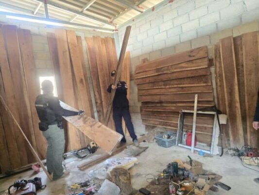ตรวจยึดได้ไม้ของกลาง ดังนี้ 1.ไม้สักแปรรูปจำนวน 36 แผ่น/เหลี่ยมปริมาตร 0.46 ลูกบาศก์เมตร คิดค่าเสียหายเป็นเงิน 55,200 บาท 2.ไม้ประดู่แปรรูปจำนวน 22 แผ่น/หลี่ยมปริมาตร 0.26 ลูกบาศก์เมตร คิดค่าเสียหาย 18,200 บาท โดยกล่าวหาว่า ผิดตาม พรบ.ป่าไม้ พ.ศ.2484 มาตรา 48 ฐาน”ภายในเขตควบคุมการแปรรูปไม้มีไม้หวงห้ามแปรรูปปริมาตรเกินกว่า 0.20 ลูกบาศก์เมตรไว้ในครอบครองโดยไม่ได้รับอนุญาตจากพนักงานเจ้าหน้าที่”