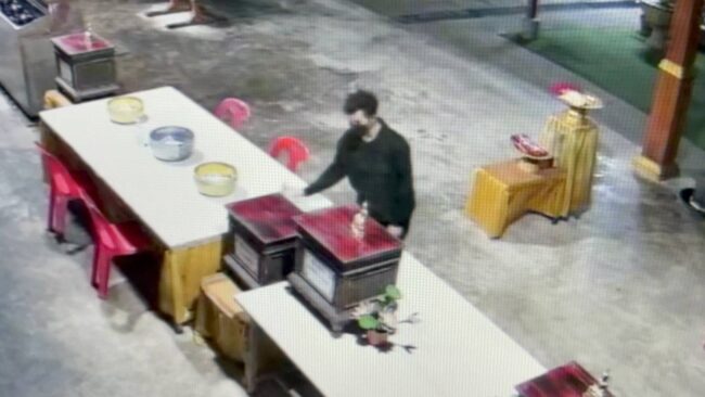 สอบถาม พระประมวล กองศรี พระลูกวัดชี้ให้ดูจุดที่คนร้ายเข้ามาก่อเหตุงัดตู้บริจาคและตู้ใส่เงินที่จำหน่ายดอกไม้ธูปเทียนสำหรับคนที่มากราบไหว้พระประธาน ที่วางไว้หน้าจุดจำหน่ายดอกไม้ธูปเทียน โดยพบว่าคนร้ายลงมือก่อเหตุงัดตู้บริจาคซึ่งเป็นตู้ไม้มีกุญแจไปจำนวน16ตู้และเอาเงินสดภายในไปมูลค่าประมาณ30,000บาท โดยภาพจากกล้องวงจรปิดสามารถบันทึกภาพเอาไว้ได้อย่างชัดเจน พบเห็นลักษณะคนร้ายเข้ามาจากทางศาลาสวดศพที่3 ด้านข้างวัด โดยปีนรั้วเข้ามาช่วงเวลา 01.11 น. ของวันนี้และอยู่ภายในวัดประมาณ1ชม.เศษ โดยปกติกล้องประตูวัดจะปิดในเวลา 21.00 น. ของทุกวัน