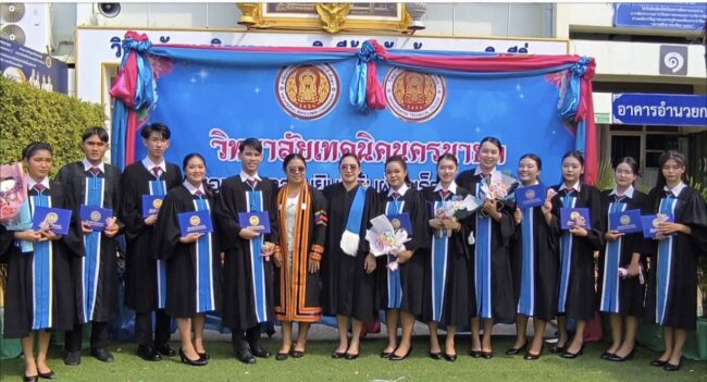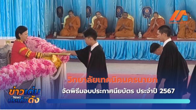 นครนายก – วิทยาลัยเทคนิคนครนายก จัดพิธีมอบประกาศนียบัตร ประจำปี 2567 มีผู้รับใบประกาศนียบัตรจำนวน 729 คนเมื่อเวลา 09.00 น.ของวัน 20 มีนาคม 2568 ที่ลานโดมอเนกประสงค์ วิทยาลัยเทคนิคนครนายก ร่มเย็น 77 ปี นางสาวสุกัญญา สุขสถาน ผู้อำนวยการวิทยาลัยเทคนิคนครนายก เป็นประธานในพิธีมอบประกาศยบัตรให้แก่นักเรียน นักศึกษา ที่สำเร็จการศึกษา ประจำปีการศึกษา 2567 โดยมีคณะครู-อาจารย์ นักเรียน นักศึกษา และผู้ปกครอง สื่อมวลชน ได้เข้าร่วมในพิธีฯ จากนั้นประธานมอบเกียรติบัตรนักศึกษาวิทยาลัยเทคนิคนครนายก พร้อมให้โอวาสแด่นักศึกษาที่สำเร็จการศึกษา จากนั้นตัวแทนผู้สำเร็จการศึกษารำกล่าวคำปฏิญาณตน และถ่ายภาพเป็นที่ระลึกกับผู้ปกครองและญาติ เป็นอันเสร็จพิธี