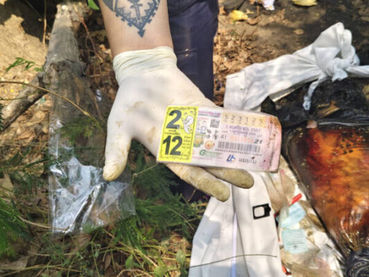 ที่บริเวณริมตลิ่ง เจ้าหน้าที่ พบ ร่างผู้เสียชีวิต ทราบชื่อ นายสายพันธุ์(หรือหนู) ชูรอด อายุ 62 ปี นอนหงายเสียชีวิตอยู่กับพื้น สภาพขึ้นอืด ที่ใบหน้าและตามร่างกายมีรอยถูกสัตว์กัดแทะ คาดเสียชีวิตมาแล้วประมาณ 1-2 อาทิตย์ ที่หัวเข่าขวา และใบหน้า มีร่องรอยการกัดคาดถูกสัตว์กัดแทะ ข้างกันพบว่ามีลักษณะเป็นเพลิงพัก ด้านในพบว่ามีกระเป๋าสะพายข้างของผู้หญิงจำนวน 2 ใบ จากการค้นตัวพบลอตเตอรี่ เลข 523125 ของงวดประจำวันที่ 1 พฤศจิกายน 2567