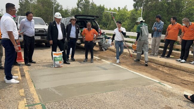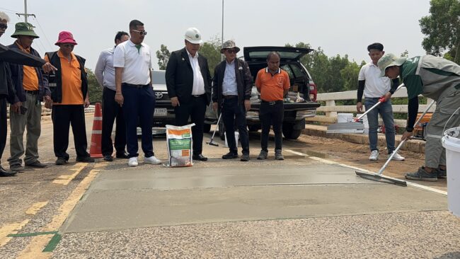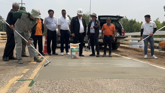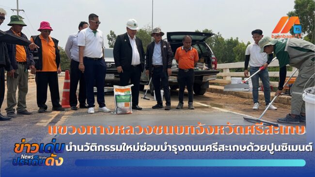 ศรีสะเกษ/แขวงทางหลวงชนบทจังหวัดศรีสะเกษ นำนวัติกรรมใหม่ซ่อมบำรุงถนนศรีสะเกษด้วยปูนซิเมนต์ ประหยัด รวดเร็ว ไม่ต้องปิดถนนเป็นระยะเวลายาวนาน ใช้ได้ทนนานปี เมื่อวันที่ 26 มีนาคม 2568 ที่สะพานข้ามลำห้วยสำราญ 2 บ้านง้อ ตำบลน้ำคำ อำเภอเมือง จังหวัดศรีสะเกษ นายสุริยันต์ ศรีพธาธนสกุล ผอ.แขวงทางหลวงชนบทศรีสะเกษ พร้อมด้วยนายสุดลักษณ์ มาโรจน์วนิช ผช.ผอ.ฝ่ายวิศวกรรมและบริการเทคนิค บริษัท จระเข้ คอร์เปเรชั่น จำกัด กรุงเทพมหานครฯ ได้เดินทางมาชมการสาธิตการซ่อมถนนด้วยนวัติกรรมใหม่ซ่อมบำรุงถนนศรีสะเกษด้วยปูนซิเมนต์ ประหยัด รวดเร็ว ไม่ต้องปิดถนนเป็นระยะเวลายาวนาน ใช้ได้ทนนานปี ซึ่งแขวงทางหลวงชนบทจังหวัดศรีสะเกษ มีถนนที่เป็นถนนปูน อยู่ในความรับผิดชอบ ใน 22 อำเภอ เป็นจำนวนมาก โดยเฉพาะบนสะพาน ซึ่งขณะนี้จากการใช้งานมาเป็นระยะยาวนาน เกิดการชำรุด เสียหาย จากระบบเดิมที่จะต้องทุบแยกเศษปูนที่ชำรุดเสียหายออก ก่อนที่จะทำการเทปูนซ่อมบำรุงใหม่ ซึ่งจะต้องใช้ระยะเวลาที่ยาวนาน หลายวัน คืออย่างน้อย 25–28 วัน กว่าปูนซ่อมจะแห้ง ใช้งบจำนวนมากกว่า นวัตกรรมตัวใหม่ที่บริษัท จะนำเสนอนี้ ว่า มีความสมบูรณ์ ในการซ่อมถนนปูนที่ชำรุด และใช้ระยะเวลาในการซ่อมสั้น แห้งไว ใช้งานได้ทันที ภายในระยะเวลาเพียง 6 ชั่วโมง ในราคางบที่น้อยกว่าวิธีเดิมมาก