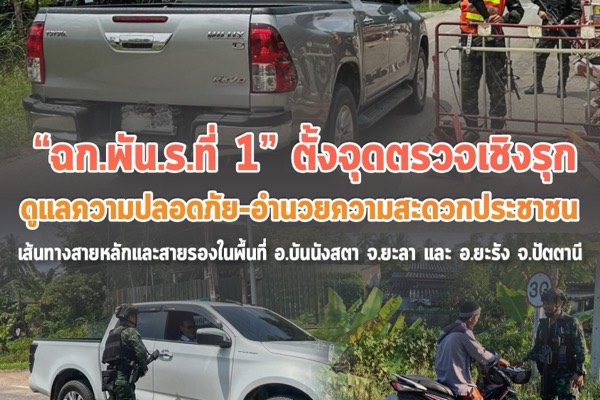 ⏭ เมื่อวันที่ 3 เมษายน 2568 หน่วยเฉพาะกิจ กองพันทหารราบที่ 1 (ฉก.พัน.ร.ที่ 1) ได้จัดกำลังพลปฏิบัติภารกิจตั้งจุดตรวจ/จุดสกัดตามแผน POP UP ของหน่วย บนเส้นทางสายหลักและสายรองในพื้นที่รับผิดชอบ ได้แก่ อำเภอบันนังสตา จังหวัดยะลา และอำเภอยะรัง จังหวัดปัตตานี