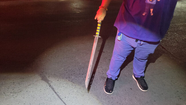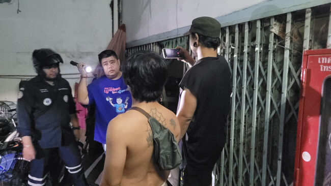 ที่บริเวณหน้าที่ทำการผู้ใหญ่บ้าน ภายในซอยดังกล่าว พบ นาย ปิยธาร ตุ่นทิทย์ อายุ 25 ปี นั่งอยู่ตรงบนเก้าอี้หน้าบ้าน มีแผลถูกฉีกขาดที่แขนขวา เป็นแผลขนาดใหญ่และลึกเกือบขาด เจ้าหน้าที่มูลนิธิให้การช่วยเหลือปฐมพยาบาลเบื้องต้น ก่อนเร่งนำส่งโรงพยาบาลเปาโลสมุทรปราการ ห่างออกไปประมาณ 30 เมตร ที่บริเวณกลางหน้าห้องเช่า พบกองเลือดจำนวนมาก และที่หน้าห้องเช่าดังกล่าวยังพบหยดเลือดที่โต๊ะหน้าตึก และพบจักรยานล้มหลายคัน จากการสอบสวนทราบว่าผู้ก่อเหตุ คือ นาย พรพรม จักรคำ อายุ 31 ปี ซึ่งพักอาศัยอยู่ห้องแรกชั้น 1 ของตึกดังกล่าว หลังก่อเหตุได้หนีเข้าไปในตึก เจ้าหน้าที่ตำรวจ จึงเข้าไปตรวจสอบก็พบตัว นายพรพรม อยู่ตรงบันได พร้อมอาวุธมีดดาบซามูไร ยาวประมาณ 1 เมตร ที่ใบดาบเปื้อนเลือด เจ้าหน้าที่ตำรวจ จึงควบคุมตัวพร้อมของกลางอาวุธมีดที่ใช้ก่อเหตุ มาสอบสวนเพิ่มเติมที่โรงพัก ส่วนผู้ก่อเหตุอีกคนได้หลบหนีไปก่อนแล้ว