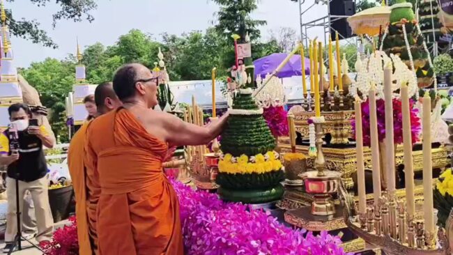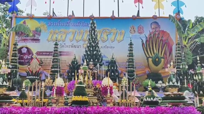 ได้นำคณะศิษยานุศิษย์หลวงปู่สรวง 2 แผ่นดินไทย – กัมพูชา และพุทธศาสนิกชนจากทั่วประเทศ ร่วมกันประกอบพิธีเปลี่ยนผ้าไตรหลวงปู่สรวง โดยมี พล.ต.ณัฏฐ์ ศรีอินทร์ รองแม่ทัพภาค 2 และพล.ต.ท.คำรณวิทย์ ธูปกระจ่าง นายก อบจ.ปทุมธานี ร่วมในพิธีเปลี่ยนผ้าไตรหลวงปู่สรวงด้วย ซึ่งคณะศิษยานุศิษย์ที่พากันแต่งกายด้วยชุดขาวได้ร่วมกันยกเอาโลงแก้วที่บรรจุสรีระสังขารของหลวงปู่สรวงลงมาจากที่ตั้งโลงแก้ว จากนั้น ได้นำสรีระสังขารของหลวงปู่สรวงออกจากโลงแก้วมาวางบนที่นอนรองรับซึ่งจัดตกแต่งไว้อย่างสวยงามพระครูโกศลสิกขกิจ และพระวัชรญาณมุนี วิ.(พระอาจารย์เทียนชัย ชยทีโป) ได้ร่วมกันนำเอาผ้าไตรจีวรมาเปลี่ยนเพื่อถวายแด่หลวงปู่สรวง ขณะที่บรรดาศิษย์ส่วนหนึ่งได้พากันนำเอาผ้าสะอาดมาเช็ดถูทำความสะอาดโลงแก้ว และนำเอาผ้าผืนที่เช็ดโลงแก้วกลับไปสักการะบูชาที่บ้านของตนเอง เมื่อทำการเปลี่ยนผ้าไตรเสร็จแล้ว คณะศิษย์ได้ร่วมกันยกสรีระสังขารของหลวงปู่สรวงขึ้นไปบรรจุในโลงแก้ว มีการประกอบพิธีทางศาสนา จากนั้น ได้ยกโลงแก้วขึ้นไปวางบนที่ตั้งโลงแก้ว โดย 2 ศิษย์เอกของหลวงปู่สรวง ได้นำคณะศิษย์สวดมนต์บูชาพระรัตนตรัย เมื่อเสร็จพิธีแล้วบรรดาชาวพุทธทุกคนที่มาร่วมพิธีได้ร่วมกันกราบขอพรและเดินพนมมือลอดใต้สรีระสังขารของหลวงปู่สรวงกันอย่างคึกคักมาก เพื่อขอพรในช่วงเทศกาลสงกรานต์ 2568 ซึ่งเป็นปีใหม่ไทยปีนี้ในโอกาสนี้ พระวินัยเมธี เจ้าคณะจังหวัดศรีสะเกษ (ธ.) พระครูโกศลสิกขกิจ เจ้าคณะอำเภอภูสิงห์ (ธ.) พระวัชรญาณมุนี วิ. พระอาจารย์ เทียนชัย ชยทีโป เจ้าอาวาสวัดเทพสรธรรมาราม ก็ได้ร่วมกันมอบรถยนต์ฉุกเฉินพร้อมอุปกรณ์ให้แก่ นพ.วีระยุทธ แก้วโมกข์ ผู้อำนวยการโรงพยาบาลภูสิงห์ มูลค่า 2.6 ล้านบาท เพื่อใช้งานประจำโรงพยาบาลภูสิงห์ ในการช่วยเหลือผู้ป่วยตามตะเข็บชายแดนไทยกัมพูชาต่อไป