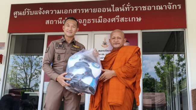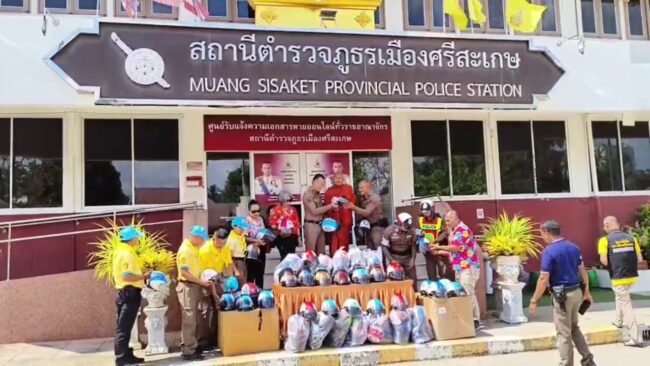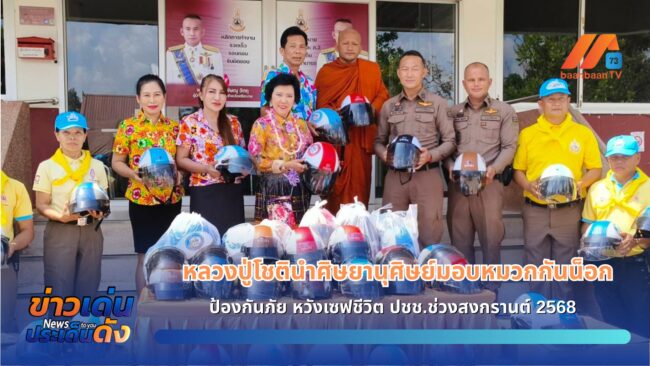 ศรีสะเกษ/ หลวงปู่โชตินำศิษยานุศิษย์มอบหมวกกันน็อกป้องกันภัย หวังเซฟชีวิต ปชช.ช่วงสงกรานต์ 2568เมื่อวันที่ 12 เมษายน 2568 ที่สภ.เมืองศรีสะเกษ อ.เมือง จ.ศรีสะเกษ พระครูวินัยธร ศักดิ์มนตรี ปภัสโร หรือพระอาจารย์โชติ เจ้าอาวาสวัดศรีสมบูรณ์รัตนาราม อำเภออุทุมพรพิสัย ร่วมกับ ดร.กัลยาณี ธรรมจารีย์ นายกสมาคมส่งเสริมเครือข่ายการท่องเที่ยวจังหวัดศรีสะเกษ และนางวาสิตา น้อยพรหม นายกสมาคมธุรกิจการท่องเที่ยวจังหวัดศรีสะเกษ พร้อมด้วย ศิษยานุศิษย์ผู้ใจบุญ ได้ร่วมกันมอบหมวกกันน็อกจำนวน 130 ใบ รวมมูลค่ากว่า 20,000 บาท ให้แก่สภ.เมืองศรีสะเกษ จำนวน 70 ใบ สภ.อุทุมพรพิสัย จำนวน 20 ใบ สภ.ปรือใหญ่ จำนวน 20 ใบ และ สภ.จะกง จำนวน 20 ใบ โดยมี พ.ต.อ.อัครพล รัศมี ผกก.สภ.ปรือใหญ่