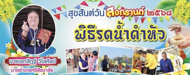 ศรีสัชนาลัย จัดกิจกรรมสรงน้ำพระและรดน้ำดำหัวนายอำเภอ เนื่องในเทศกาลสงกรานต์ ประจำปี พ.ศ.2568 24 เม.ย.2568 เวลา 13.00น.ที่บ้านพักนายอำเภอศรีสัชนาลัย นายเอกสิฏฐ์ วิไลศิลป์ นายอำเภอศรีสัชนาลัย เป็นประธานในการจัดกิจกรรมสรงน้ำพระและรดน้ำดำหัวนายอำเภอศรีสัชนาลัย เนื่องในเทศกาลสงกรานต์ ประจำปี พ.ศ.2568 นายนิรันดร์ พรมละ ปลัดอำเภอหัวหน้ากลุ่มงานบริหารงานปกครองชำนาญการ เป็นผู้นำกล่าวเปิดงาน พร้อมด้วยหัวหน้าส่วนราชการ ปลัดอำเภอ นายกองค์กรปกครองส่วนท้องถิ่น ข้าราชการ เจ้าหน้าที่และกำนัน ผู้ใหญ่บ้านบ้าน ผู้ช่วยผู้ใหญ่บ้าน สารวัตรกำนัน แพทย์ประจำตำบล ในพื้นที่อำเภอศรีสัชนาลัย ร่วมกันสรงน้ำพระพุทธนวราชบพิตรและรดน้ำดำหัวขอพรจากนายเอกสิฏฐ์ วิไลศิลป์ นาย