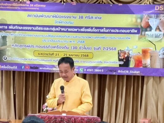 เมื่อวันที่ 25 เมษายน 2568 ที่ห้องประชุมองค์การบริหารส่วนตำบลหนองไฮ อำเภออุทุมพรพิสัย จังหวัดศรีสะเกษ นายสมบัติ ดวงแก้ว สมาชิกสภาองค์การบริหารส่วนจังหวัดศรีสะเกษ เป็นประธานมอบวุฒิบัตรผู้สำเร็จการฝึกอบรมโครงการเพิ่มทักษะแรงงานอิสระและกลุ่มเป้าหมายเฉพาะเพื่อเพิ่มโอกาสในการประกอบอาชีพ ประจำปีงบประมาณ 2568 หลักสูตร ผู้ประกอบการธุรกิจเครื่องดื่ม ในระหว่างวันที่ 21-25 เมษายน 2568