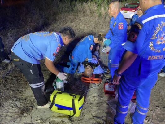 นครปฐม250468สลดโชเฟอร์แท็กซี่หัวใจวายคารถก่อหน้ามีเหตุเฉี่ยวชนและทะเลาะกัน เกิดเหตุสลดพบโชเฟอร์แท็กซี่วัย 59 ปีหมดสติขับรถเสียหลักตกข้างทาง กู้ภัยเร่งปั๊มหัวใจช่วยแต่ไม่ทันเสียชีวิต พบก่อนหน้ามีเรื่องรถเฉี่ยวชนและทะเลาะกับคนขับรถหกล้อที่ถนนเพชรเกษม คนตายขับรถไล่หาคู่กรณี คาดตกใจจนหัวใจวายดับ ญาติโพสต์ตามหารถคู่กรณีผู้สื่อข่าวรายงานว่าเมื่อเวลา เวลา 20:37 น.ของวันที่ 24 เมษายน 2568 มูลนิธิกู้ภัยพรานพิทักษ์ อ.สามพราน จ.นครปฐม ได้รับแจ้งเหตุมีชายหมดสติภายในรถ บริเวณใกล้เคียงแยกหนองนกไข่ ถนนคลองใหม่ หมู่7 ต.บางช้าง อ.สามพราน จ.นครปฐม จึงรีบไปให้การช่วยเหลือในที่เกิดเหตุเป็นลานดินพบรถแท็กซี่ สีขาวชมพู ทะเบียน ทฬ 3991 กทม.หน้ารถพุ่งลงในพงหญ้า ห่างจากถนนเกือบ 100 เมตร ที่นั่งคนขับพบนายสุรชัย ชลอยบุญ อายุ 59 ปี อยู่บ้านเลขที่ 112 หมู่ 6 ต.ท่าข้าม อ.สามพราน จ.นครปฐมสภาพนั่งหมดสติภายในเบาะคนขับ เจ้าหน้าที่มูลนิธิกู้ภัยพรานพิทักษ์จึงนำลงมาจากรถ ปฐมพยาบาลและ CPR พร้อมประสานขอรถทีมแพทย์กู้ชีพ รพ.สามพราน แต่ทีมแพทย์กูชีพมาถึงได้ตรวจเช็กพบว่านายสุรชัย ชลอยบุญ เสียชีวิตแล้ว จึงแจ้งพนักงานสอบสวนและชุดสืบสวน ร่วมด้วยสอบ