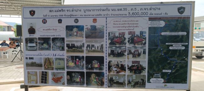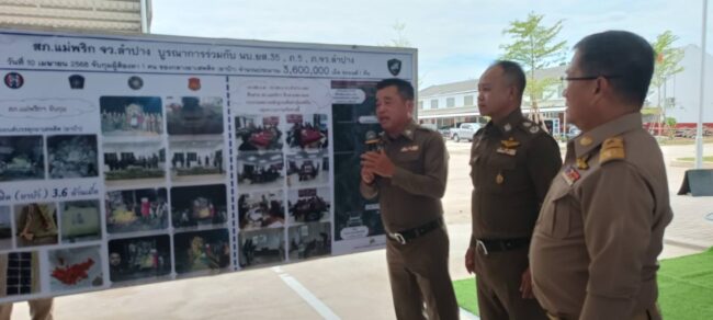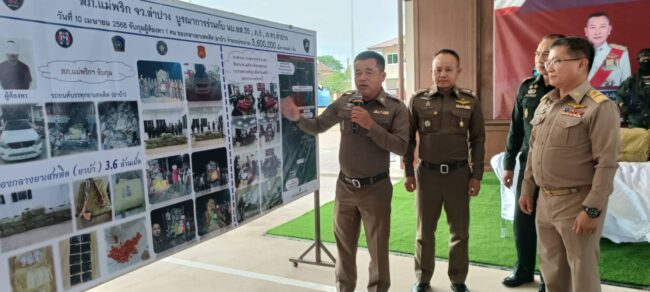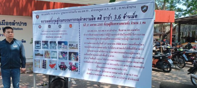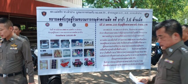 ลำปาง-ตำรวจฯลำปาง สภ.แม่พริก และ ตำรวจฯตาก บูรณาการ ขยายผลจับกุมผู้ร่วมขบวนการคดียาบ้า เมื่อเวลา 13.00 น.วันที่ 28 เม.ย.2568 ที่ จ.ลำปาง ผู้สื่อข่าวรายงานว่า พ.ต.อ.กฤษดา พันธ์เกษม รอง ผบก.ภ.จว.ลำปาง พร้อมด้วย พ.ต.อ.ประสิทธิ์ หล้าสมศรี ผกก.สภ.แม่พริก ร่วมแถลงกรณีตำรวจ ภ.จว. ลำปาง สภ.แม่พริก และ ตำรวจ ภ.จว.ตาก บูรณาการ ขยายผลจับกุมผู้ร่วมขบวนการคดียาบ้า เมื่อเวลา 11.15 น.วันที่ 27 เม.ย.ที่ผ่านมา ตำรวจ สภ.แม่พริก ร่วมกับ กก.สส.ภ.จว.ตาก ได้ร่วมกับจับกุมผู้ต้องหาคือนายชัยชาญ อายุ 26 ปี ชาว ต.แม่นาวาง อ.แม่อาย จ.เชียงใหม่ ตามหมายจับของศาลจังหวัดลำปางที่ จ.192/2568 ลงวันที่ 25 เม.ย.2568