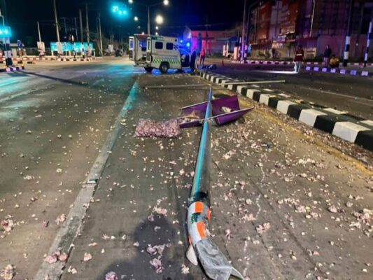เศษซากต่างๆ บนท้องถนน เพื่ิอเปิดการจราจรบนถนนดังกล่าวด้วย จากการนำเจ้าหน้าที่ฝ่ายป้องกันฯเทศบาลเมืองมุกดาหารออกตรวจสอบช่วย้หลือ พบรถกู้ชีพขององค์การบริหารส่วนตำบลบ้านโคก ชนกับรถกระบะโตโยต้า บรรทุกกระเทียมมาเต็มคัน หมายเลขทะเบียน บต 8819 มุกดาหาร จนทำให้รถมีสภาพเกือบหักครึ่งท่อนเศษซากชิ้นส่วนรถและกระเทียมกระจายเกลื่อนพื้นถนน เสาไฟฟ้าและป้ายแจ้งเตือนจราจรหักเสียหาย เจ้าหน้าที่ฝ่ายป้องกันฯ จึงได้ทำการเก็บเศษซากต่างๆบนพื้นถนนจนทำให้สามารถเปิดการจราจรตามปกติได้ในเวลาต่อมา #รถกู้ชีพชนปะทะรถขนกระเทียมกระจายเกลื่อนสี่แยกมุกดาหาร #จังหวัดมุกดาหาร